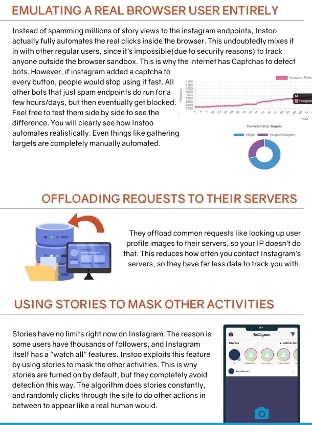 Whatever; undoubtedly, whenever you use Instoo, you can realize the main difference between other bots; it mainly provides realistic automate services. Even you see other bots, services eventually within hours or day would be blocked. Moreover, Instoo always works perfectly manually automated for gathering targets.